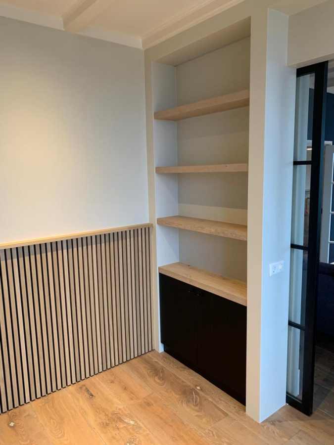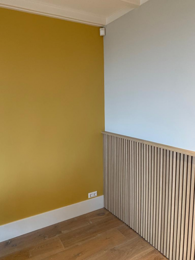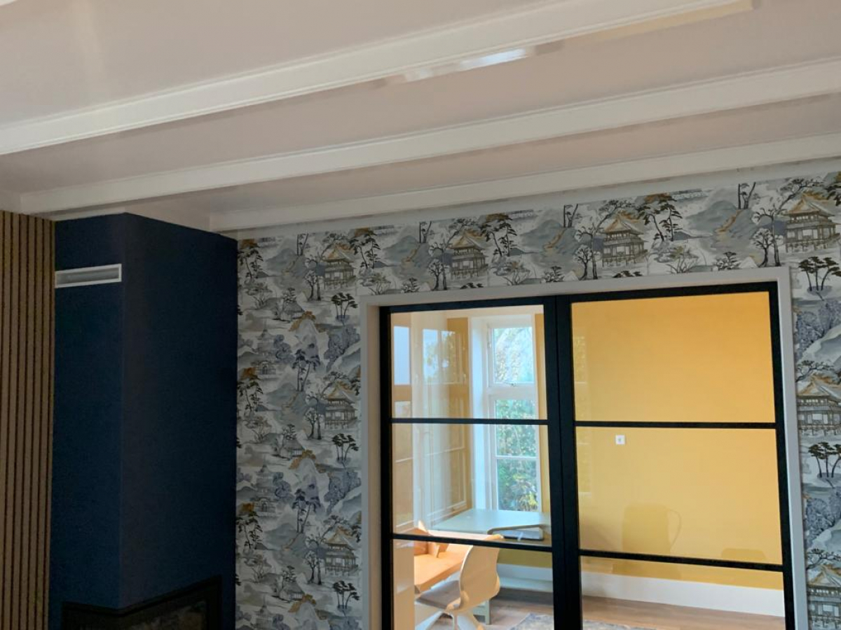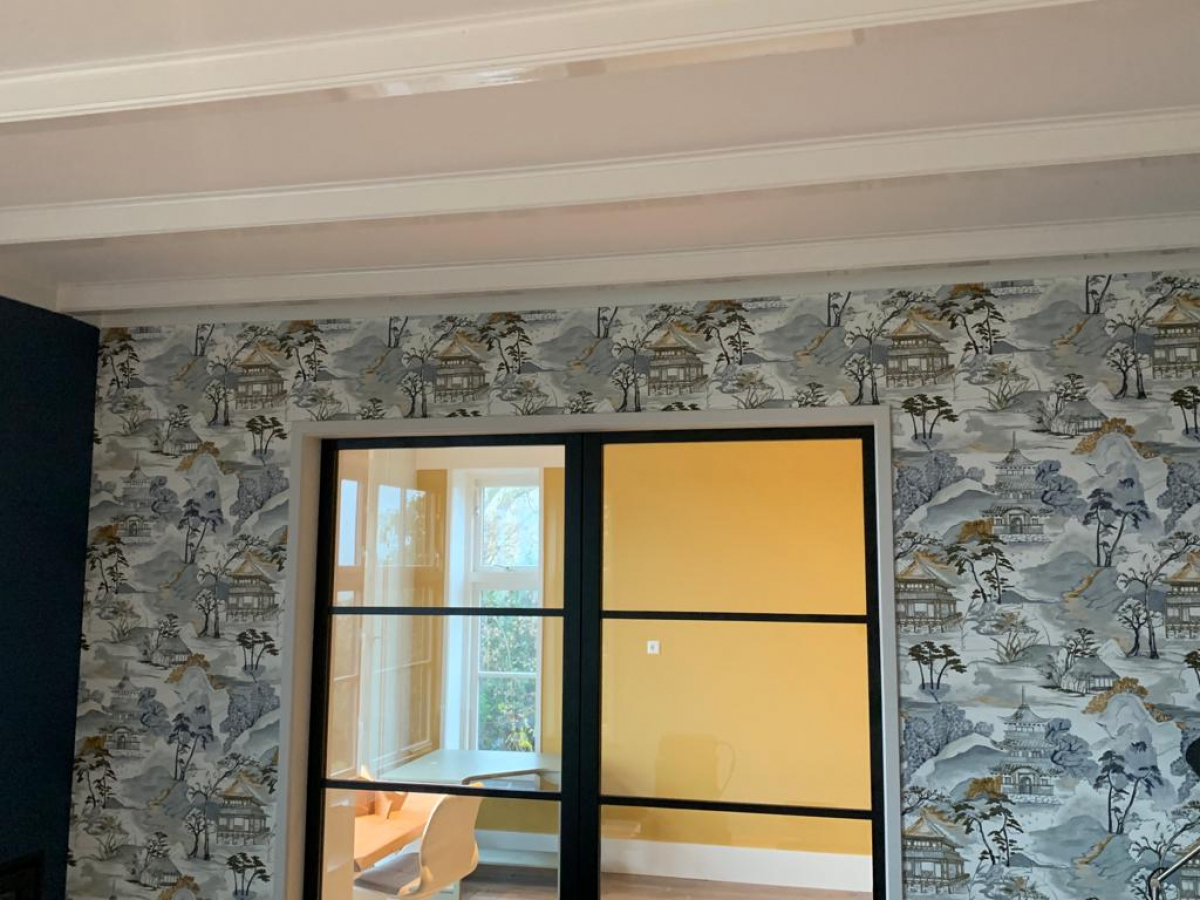 Muren gesausd, kozijnen schilderen en aanbrengen van patroon behang.